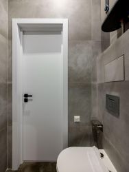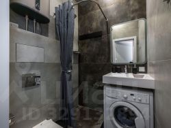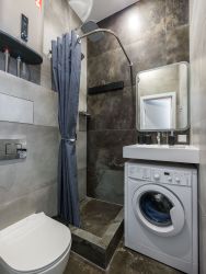 Ванная комната: Современная душевая, свежие полотенца, фен и стиральная машина.