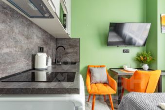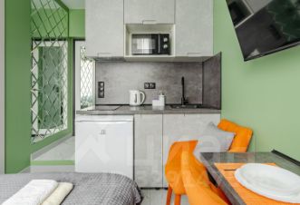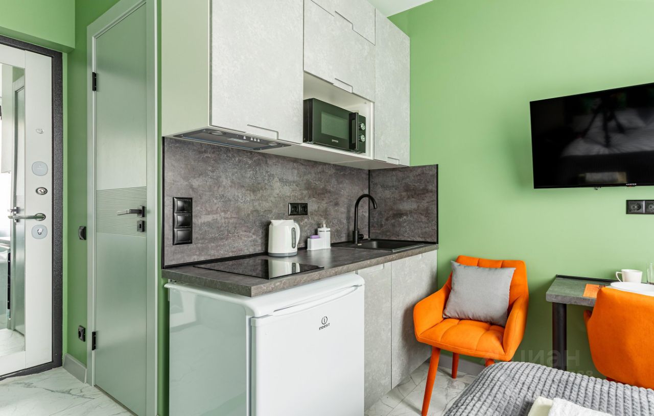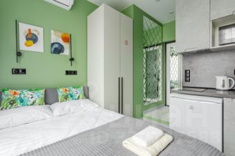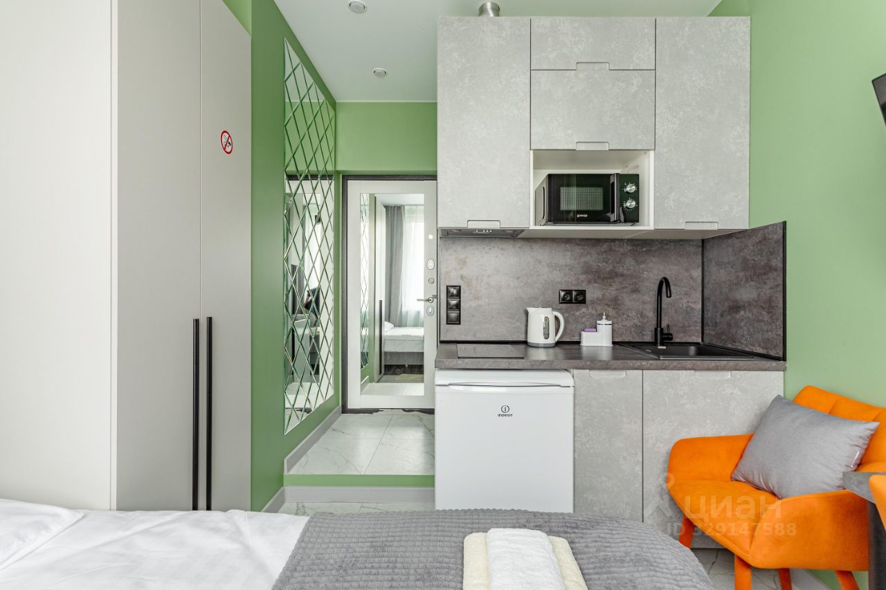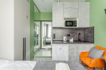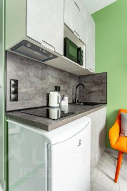 Сдается уютная студия на четвертом этаже современного Жилого комплекса Легендарный Квартал. Общая площадь апартаментов составляет 12 кв. м, с жилой зоной 7 кв. м и кухней в 3 кв. м. Благодаря дизайнерскому ремонту, квартира выглядит стильно и современно. Окна выходят во двор, поэтому здесь тихо и спокойно.