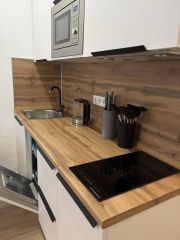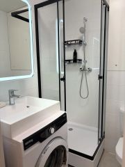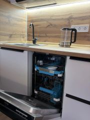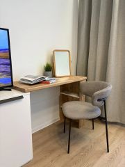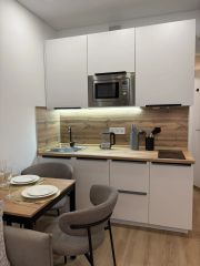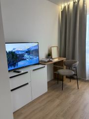 Оборудован раскладной обеденный стол. Диван трансформируется в спальное место размером 140 см. Посуда и столовые приборы находятся в наличии. На случай отключения горячей воды установлен мощный водонагреватель Electrolux. Для защиты от протечек смонтирован датчик Neptun. Роутер TP-Link готов к подключению.