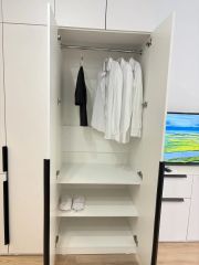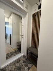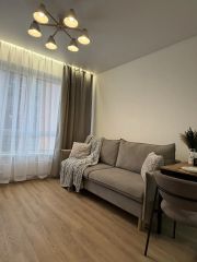 В помещении установлено следующее оборудование: техника брендов Korting (чайник, стиральная машина, посудомоечная машина, встроенный холодильник), Kuppersberg (плита и вытяжка), микроволновая печь Smeg, кондиционер Suzuki. На кухне смонтированы смеситель и мойка Omoikiri. Также установлен телевизор Samsung диагональю 43 дюйма. Мебель выполнена из МДФ с фасадами, оснащенными доводчиками. В квартире предусмотрено множество мест для хранения вещей. Реализована многоступенчатая система освещения, включающая: 1) люстру, 2) подсветку кухонной зоны, 3) подсветку столешниц, 4) подсветку карниза.