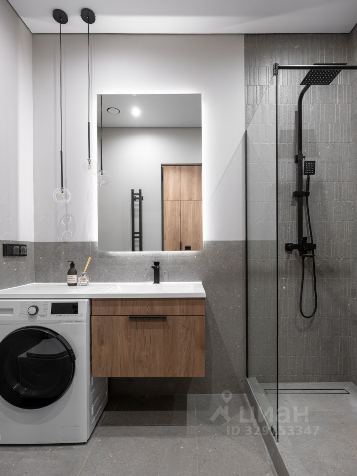 - в ванной комнате оснащена душевая кабина, стиральная машина с функцией сушки, санузлом и теплым полом.