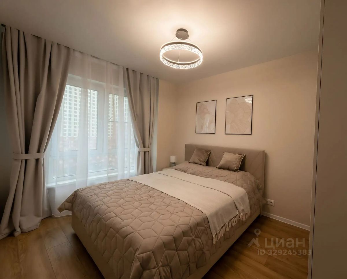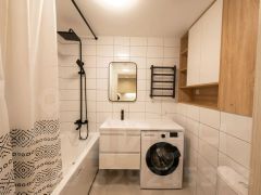Уютная квартира, укомплектованная всей необходимой для комфортного проживания мебелью и техникой (большая двуспальная кровать, два шкафа, раскладной диван, обеденная зона, встроенные: холодильник, духовой шкаф, варочная панель, вытяжка, посудомоечная машинка, СВЧ-печь; телевизор, стиральная машинка, кондиционер, дополнительные осветительные приборы с несколькими сценариями освещения).