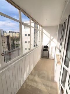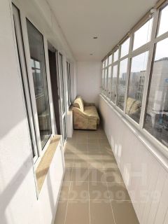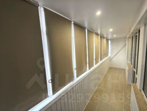 Большая застекленная лоджия с плиточными полами, ролл-шторами блэкаут и диваном.