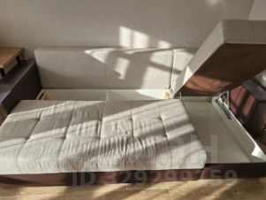 Большая комната с раскладным диваном и рабочим столом, который можно превратить в барную стойку.