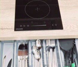 Кухня укомплектована всей необходимой техникой: холодильник, индукционная плита, чайник, микроволновка.