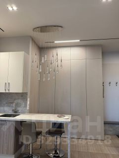 1. Кухня-гостиная с современным кухонным гарнитуром, барной стойкой, встроенной бытовой техникой Neff
