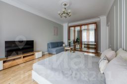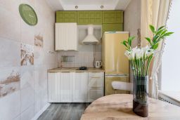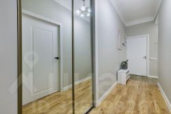 На кухне красивый гарнитур с единой столешницей и встроенной техникой, обеденная зона. Санузел раздельный, с ванной, евростандарт в плитке до потолка. В прихожей большой шкаф для верхней одежды, электроплита, кондиционер, металлическая дверь, домофон, свч-печь, электрический чайник, утюг с гладильной доской, фен, посуда и принадлежности, кабельное тв, постельные принадлежности.