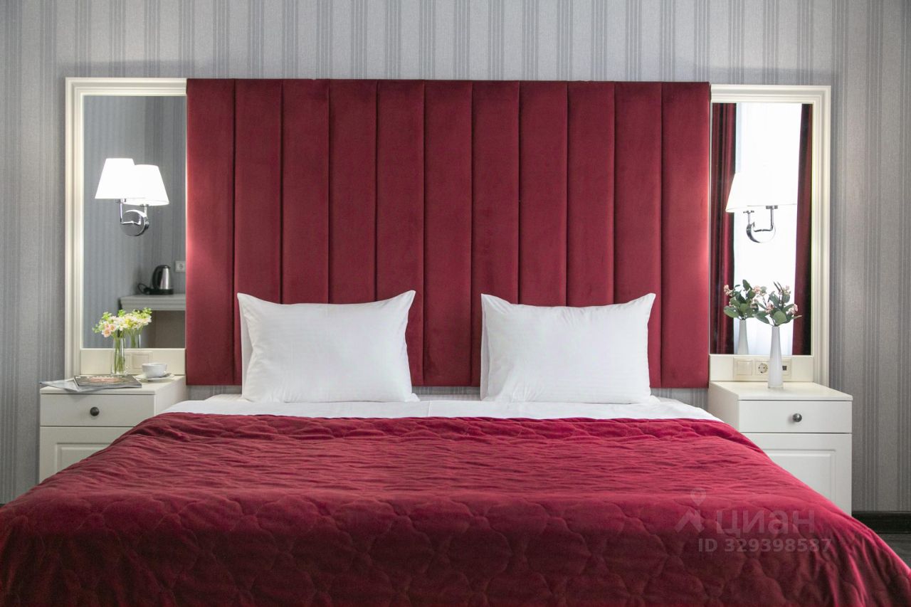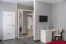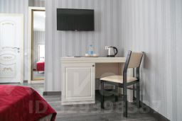 Двухместный номер Делюкс оснащен одной двуспальной кроватью размера king-size (200*200 см) и оборудован всем необходимым для комфортного проживания: кондиционером, шкафом, письменным столом, телевизором, электрочайником, прикроватными бра, розетками, тумбочками, ортопедическим матрацем, который обеспечит комфортный отдых любому, даже самому восприимчивому Гостю.