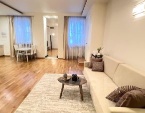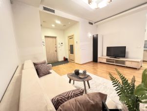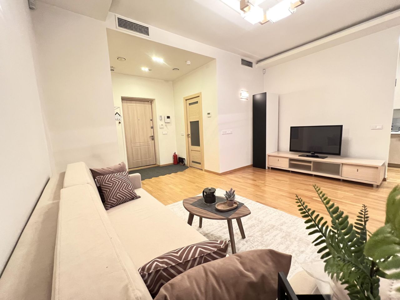 Квартира полностью укомплектована мебелью и техникой: духовой шкаф, варочная панель, микроволновка, телевизор, стиральная машина, холодильник. Установлены кондиционеры и система климат-контроля.