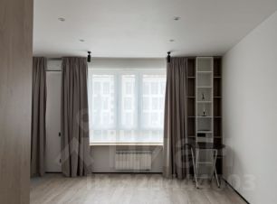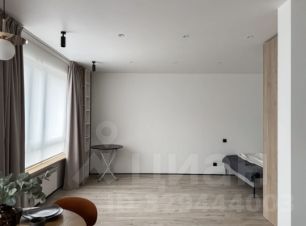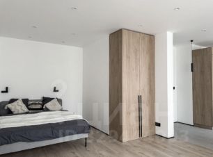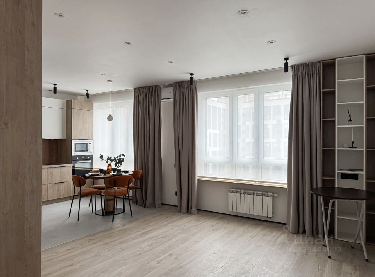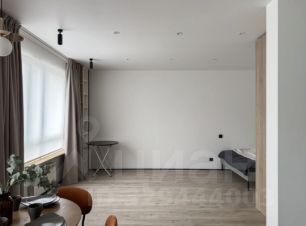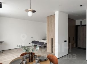Студия с продуманной планировкой и стильным минималистичным интерьером в пастельных оттенках.