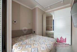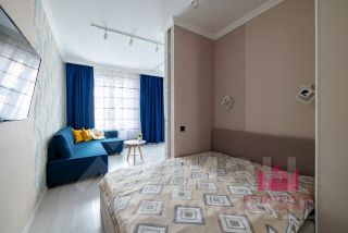 - СПАЛЬНАЯ КОМНАТА не изолирована, но в стене предусмотрен разъем для установки выдвижной двери-перегородки. Здесь расположена большая двуспальная кровать и глубокий шкаф-купе в выделенной нише!