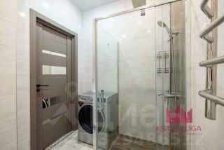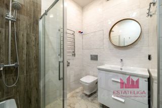 - В отделке ванной комнаты используется крупноформатный керамогранит. Установлена душевая система, водяной полотенцесушитель, инсталляция, ванная гарнитура с зеркалом. Вмонтирован скрытый сантехнический люк с коллекторной разводкой. Выведена трасса для кондиционера.