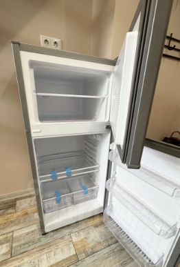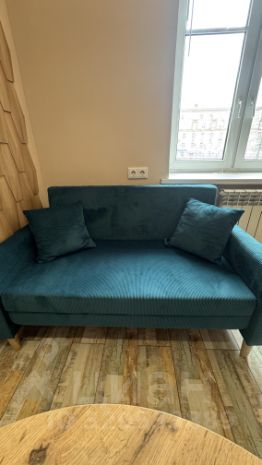 Мебель: диван, кухонный гарнитур, кровать, вместительный шкаф, обеденный стол, табуреты.