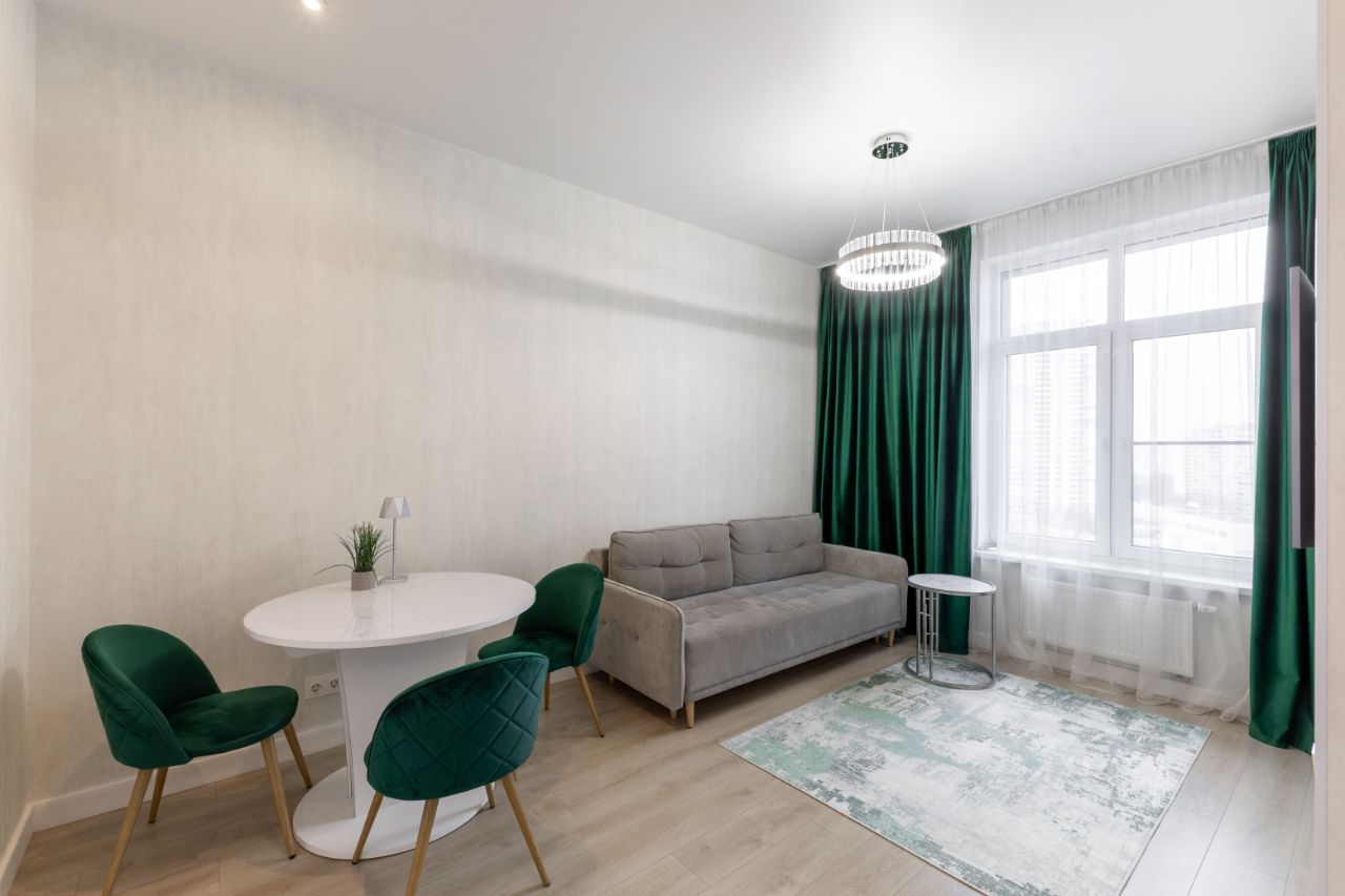 Планировка — одно из главных преимуществ: отдельная спальня и просторная кухня-гостиная. По ощущениям это не типовая однушка, а удобный евроформат с полноценной зоной отдыха, обеденной группой и отдельным приватным пространством для сна.