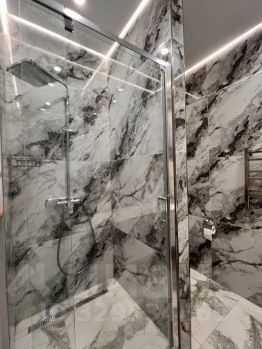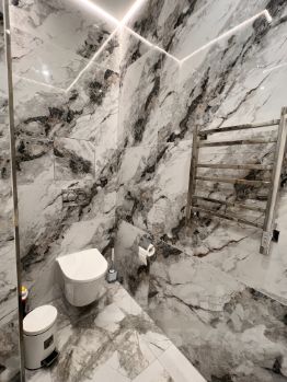 Совмещённый санузел оформлен в современном стиле с использованием качественных материалов.