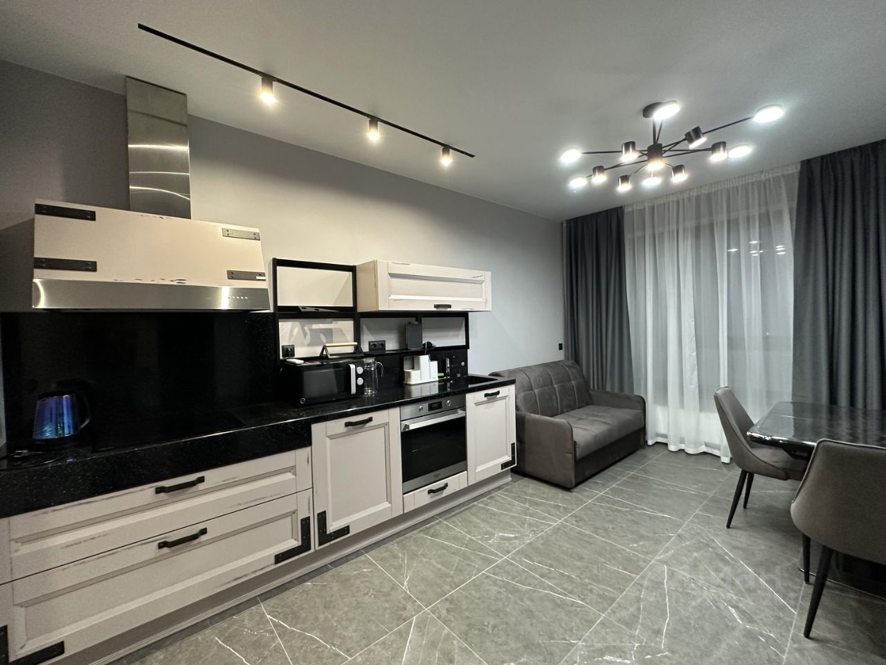 Квартира с дизайнерским ремонтом, полностью готова к комфортному проживанию. Просторная кухня оборудована всей необходимой техникой: холодильник, посудомоечная машина, стиральная машина. В комнатах и на кухне есть мебель. Для вашего комфорта установлены кондиционер и телевизор. В ванной комнате — современная ванна.