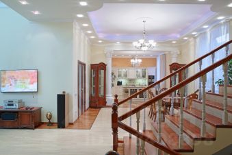 В доме каминный зал, кабинет, 3 спальни, столовая, 5 санузлов, гардероб,2 камина, бильярдная (бильярд 12 футов),бассейн с аттракционами(водопад, гейзер, искусственное течение, гидромассаж),баня на дровах , 2 зоны барбекю, на втором уровне- две большие террасы, в цокольном этаже- квартира прислуги с отдельным входом, подсобные помещения, мастерская, холодильная камера 10 м3, оружейная, и т. д. Интернет скоростной оптоволокно - 4G +WiFi. TV аналоговое и цифровое НТВ+, караоке, акустика Marantz, B&W, возможен телефон. Гараж на два автомобиля, оборудован смотровой ямой. Коммуникации: магистральный газ, электричество 380 в. Артезианская скважина.Система водоочистки. Септик.