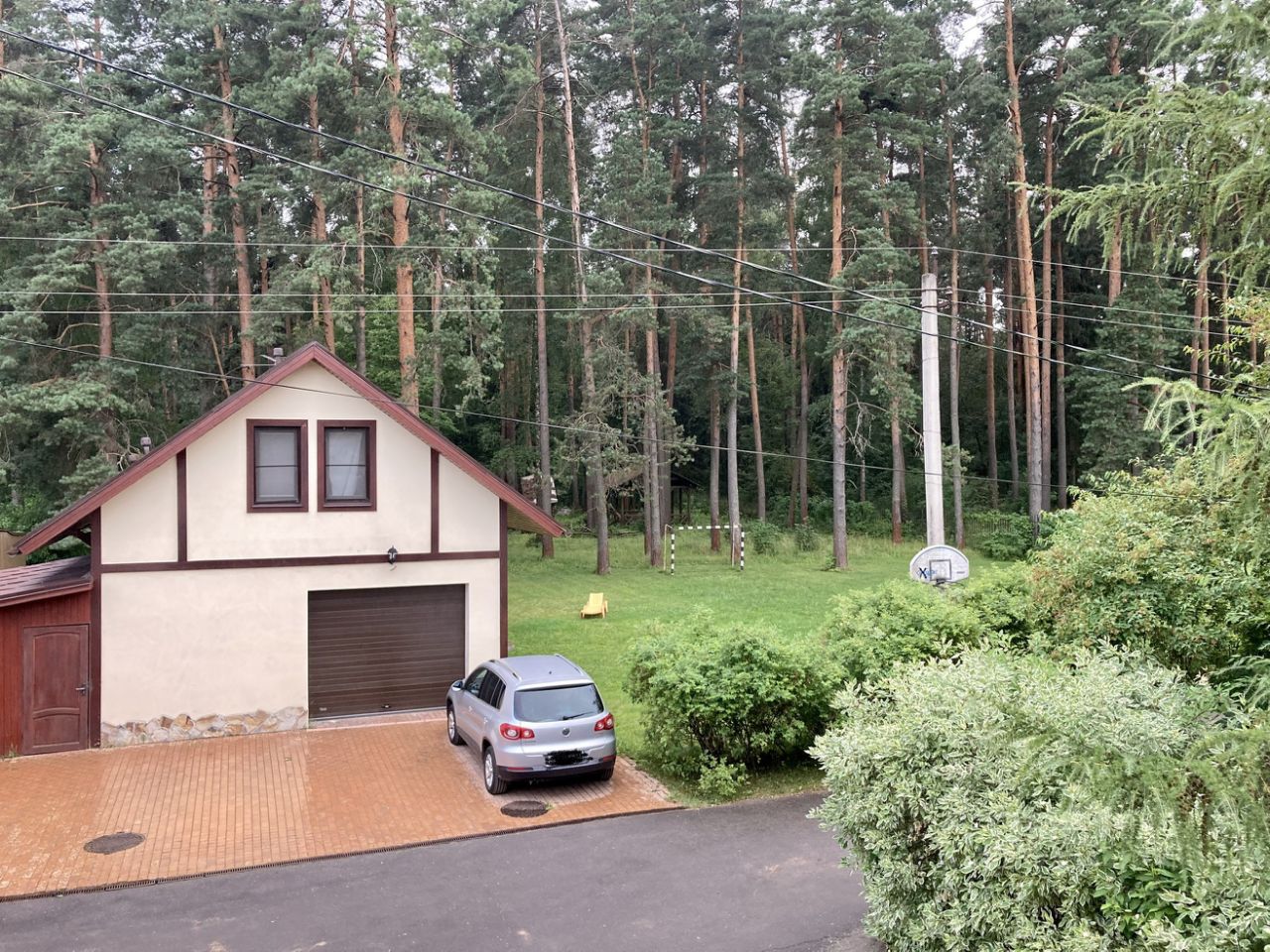 На большом лесном участке есть беседка с мангальной зоной и футбольное поле с воротами.