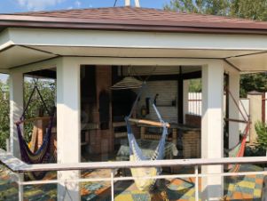 В беседке питьевая вода, свет, гамаки. На территории цветочный и фруктовый сад.