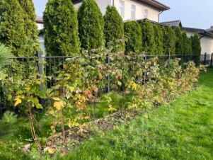 7. фруктовые деревья, малина, цветы + живая изгородь туями и диким виноградом