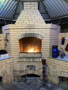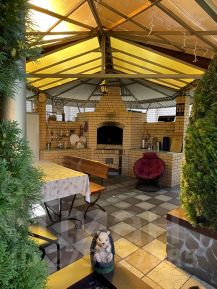 Также Зона барбекю под крышей, с большой печкой-мангал для жарки шашлыка и рыбки, барбекю оборудовано как полноценная кухня, мойка, подключена холодная горячая вода, казаны, сковороды, кастрюли, чайник, тарелки, приборы, шампура, решётки для гриля, музыка, большой стол и стулья.