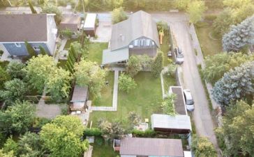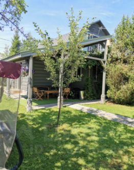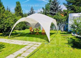 В саду плодовые деревья, крытый мангал - барбекью зона.