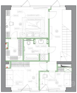 Спальня с отдельной гардеробной комнатой, детская, кабинет, сан узел.