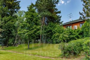 Участок разноуровневый, вымощен брусчаткой и засеян шикарным газоном, в ночное время освещается. По границе участка протекает природный водоем, высажены разнообразные декоративные и плодовые деревья и кустарники.
