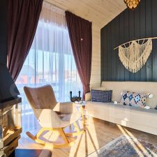 — Гостиная с камином, креслом-качалкой, раскладным диваном и смарт-ТВ