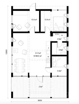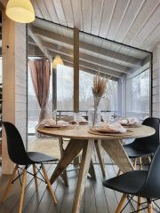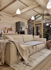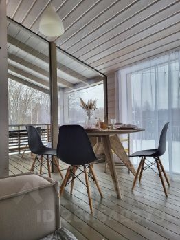 Дубльдом это просторный современный дом с панорамными окнами. Деревянный, одноэтажный. Общая площадь 100 м2, жилая 65. Четыре комнаты, три спальни + большая кухня-гостиная 30м2. Просторная огороженная веранда. В доме две кровати 140х200, диван-кровать + большой диван-кровать в гостиной. Здесь легко поместится семья из четырех человек, однако обращаю внимание, что дом не подходит для шумных вечеринок.