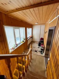 3 этажа, общая площадь 170, жилая~90: 1 технический и подсобный, 2 и 3 жилой. На втором этаже: прихожая, гостиная 25 м2, кухня 10 м2, комната 10 м2 и санузел с душевой кабиной. На третьем этаже 2 комнаты: 25 и 16 м2.
