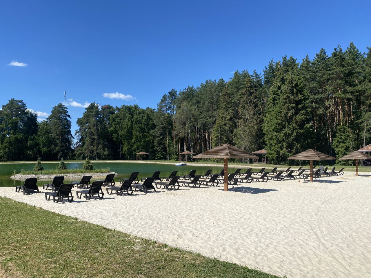 Рядом: Озеро с песчаным пляжем, лежаками и беседками
