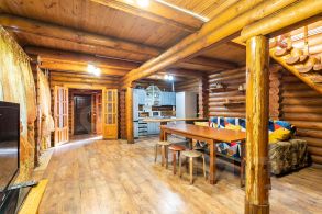 - На первом этаже: большая на 10 человек русская баня-сауна(топится дровами), дубовая купель с обливным ведром, просторная гостиная полностью оснащена профессиональной техникой, аудио-видео аппаратурой, караоке, светомузыкой и т.д., кухня оборудована всей необходимой бытовой техникой для приготовлении различных блюд, посуда, столовые приборы и т.д., также санузел с душевой.