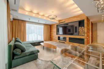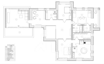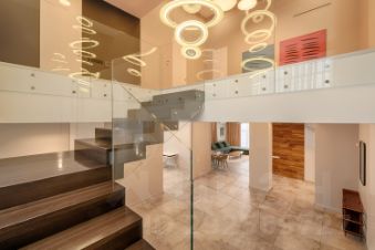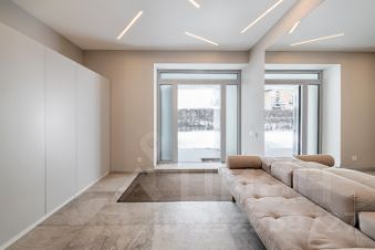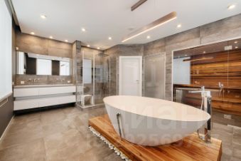 Холл с высокими потолками (5 м), зона мастер-спальни с высотой потолков 5 м (электроприводы штор), гардеробной, оружейным сейфом и большой ванной комнатой с сауной, домашним кинотеатром (звук 5.1 и отдельный звуковой ряд в сауне), детская спальня с отдельным санузлом и гардеробной, гостевая спальня, санузел, развлекательная зона с большим кинозалом с панорамными окнами (электроприводы штор), профессиональным мультимедийным оборудованием, максимальной диагональю экрана и общим управлением всех устройств с помощью планшета, дополнительное свободное помещение/игровая зона