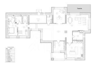 Прихожая с гардеробом, холл, отдельная гардеробная, кухня, гостиная с камином (с электрофорсировкой подачи воздуха) и встроенным домашним кинотеатром (звук 5.1) с выходом на веранду, рабочий кабинет (либо многофункциональная комната), санузел с душевым уголком для животных, подсобное помещение, постирочная, тренажёрный зал с беговой дорожкой и шведской стенкой, спальня с собственным санузлом (для гостей или персонала).