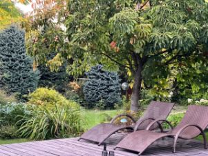 На участке есть ещё один дом, где живём мы, но всё спланировано так, что зелёные насаждения и грамотная планировка полностью скрывают обзор. Вас никто не побеспокоит — только тишина, природа и вы.