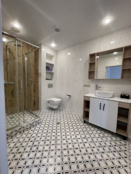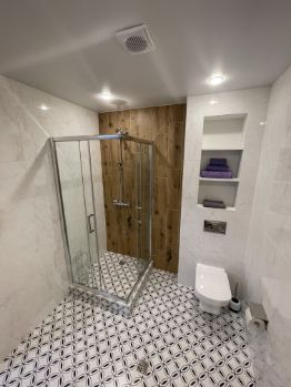 1-й этаж: прихожая, зал-столовая-кухня, санузел с душевой кабиной и стиральной машиной.