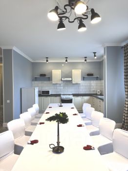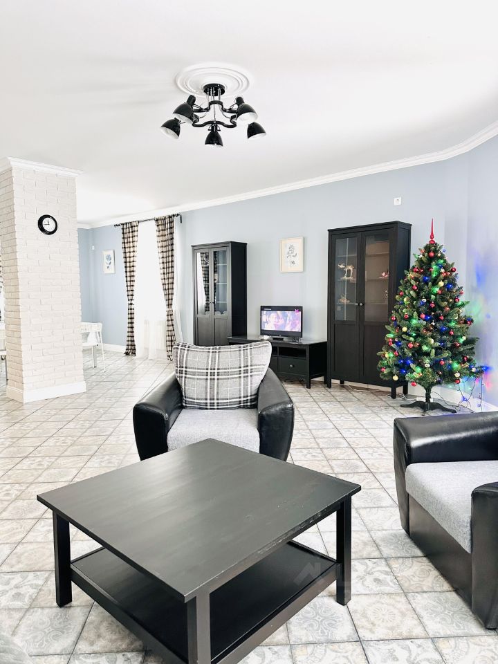 - Просторная гостиная с большим столом и выходом в сад, где также имеется уличная мебель с беседкой и мангалом.