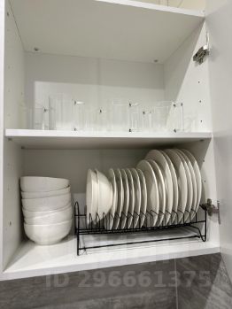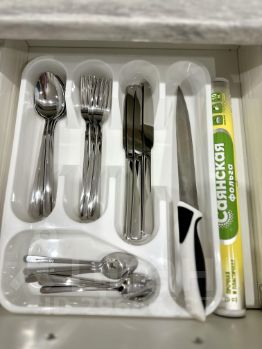 На кухне есть удобная и стильная мебель и вся необходимая посуда.