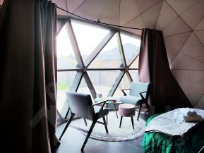 Спальня-студия с панорамным видом на лес, с круглой кроватью диаметром 2 м, кухонной зоной, антресолью для детей и/или взрослых со спальным местом 140*200, санузел, прихожая, терраса 12*9,5 м. Удобная и стильная мебель, техника, вся необходимая посуда, чистое белье, банные халаты и полотенца, также мыльные принадлежности.