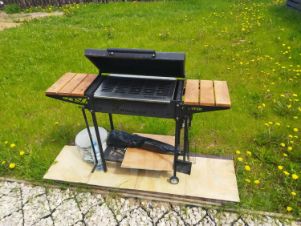 На террасе кресла-шезлонги со столиком, рядом мангал с крышкой для шашлыков и барбекю.