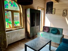 - уютная большая гостиная-кухня с высокими потолками и раскладным диваном,