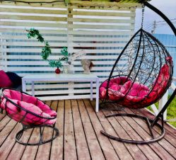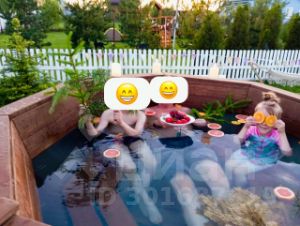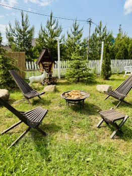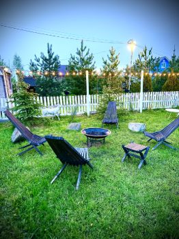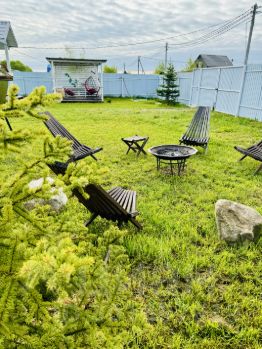 На участке красивая беседка с освещением, садовой мебелью, большим столом. Мангал со всем необходимым для жарки мяса и овощей. Парковочные места на 2-3 машины с видеонаблюдением. Атмосферная костровая зона с костровой чашей для уютных посиделок у костра. Банный чан и купель джакузи(оплачивается отдельно)Детская песочница, качели, скамейка. Волейбольная площадка, можно играть в бадминтон. Шезлонги для отдыха и принятия солнечных ванн.