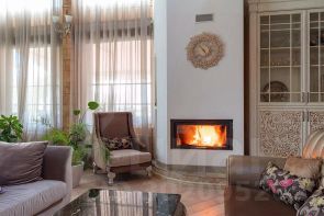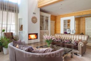 - Светлая и просторная гостиная с огромными окнами второго света с видом на сосны, современный камин, зона для общения и столовая зона