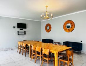 В доме 2 этажа , бильярдная в цоколе , баня. На 1 этаже просторная гостиная (55 кв.м) с обеденными столами (до 20 посадочных мест) , тв и музыкальной системой, и две комнаты , при необходимости их можно использовать как спальни, санузел , кухня с бытовой техникой и посудой , выход на террасу и к мангальной зоне (два мангала , беседка). На 2 этаже расположена гостиная 65 кв.м, может использоваться как банкетный зал или танцевальный . Так же на 2 этаже расположен второй санузел , три спальни с двухспальными кроватями и раскладным диваном в каждой , баня. Всего в доме 6 стационарных спальных мест (двухспальные кровати) и 12 дополнительных (диваны). В стоимость аренды входит все необходимое для полноценного отдыха : постельное белье, полотенца, посуда (по количества гостей в брони), бильярд, тв, музыкальная система, мангальные принадлежности (решетки , шампура, мангалы).
