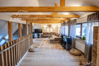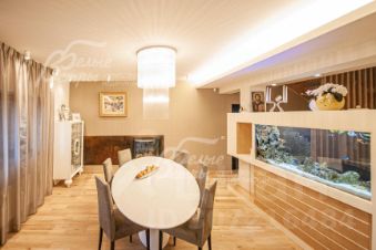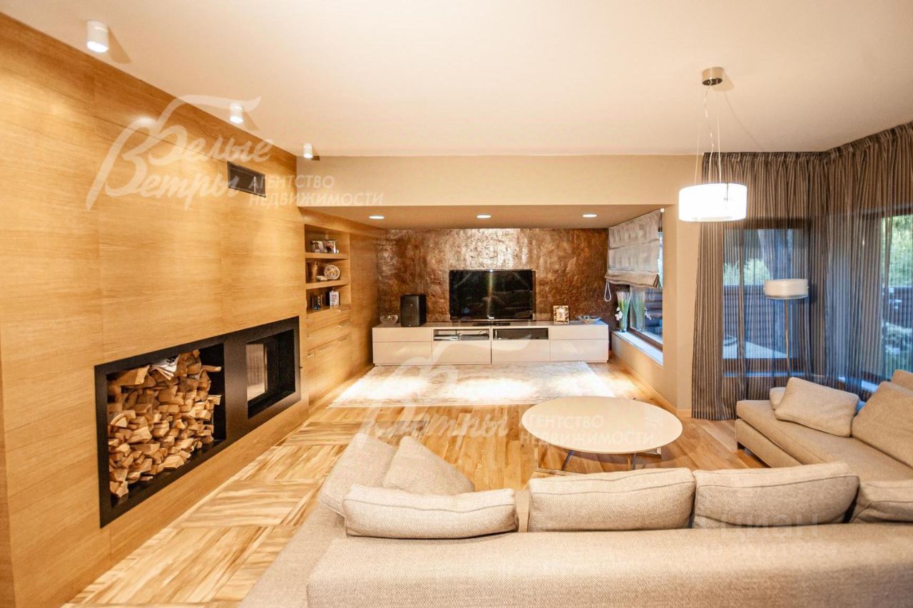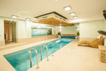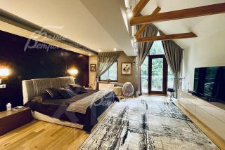 Описание внутренней отделки: в отделке использованы натуральные, экологически чистые материалы. На стенах деревянные панели, декоративное покрытие и фактурные элементы (в том числе художественное панно), остальные стены покрашены. На полу в санузлах плитка с водяным подогревом. На стенах и на потолках - деревянные балки. Полы: эко-массив дуба. В СПА-зоне роспись на стене, выполненная художником. Бассейн с противотоком. Полы в СПА-зоне с антискользящим керамическим гранитом. Сауна из канадского кедра. Камин гильотинного типа. Встроенное в потолок освещение, а также подвесные современные люстры. Весь интерьер проработан декораторами..