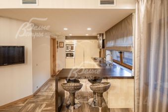 Мебель, оборудование: установлен стильный кухонный гарнитур Scavolini (Италия) молочно-кремового цвета, с барным столом и встроенной техникой: посудомоечная машина Bosch, духовой шкаф Siemens, газовая панель Bosch, холодильник AEG и морозильная камера Liebherr, кофемашина Siemens. Стиральная машина Bosh, телевизоры Samsung. Итальянская мебель Minotte и Meridiani. Дизайнерские люстры, шторы, светильники..
