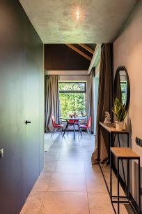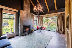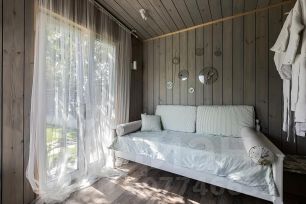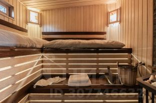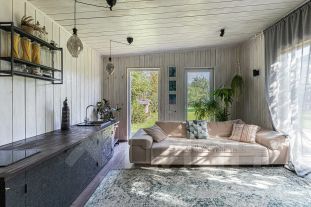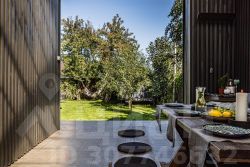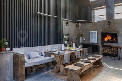 Из кухни выход на огромную крытую отапливаемую террасу (35 кв.м) с остеклённым потолком, высотой 6 м. Дровяной камин, зона барбекю и обеденная зона на 10-12 человек.