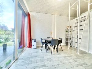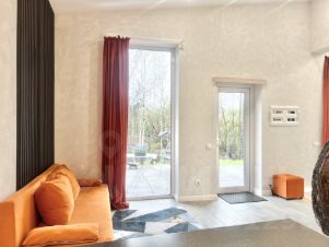 На территории 2 домика: тёплый оранжевый и освежающий бирюзовый — каждый с собственной зоной отдыха.