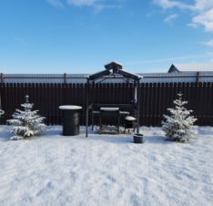 Мангальная зона: мангал, шампура, решетка для гриля, казан с печью, стол.